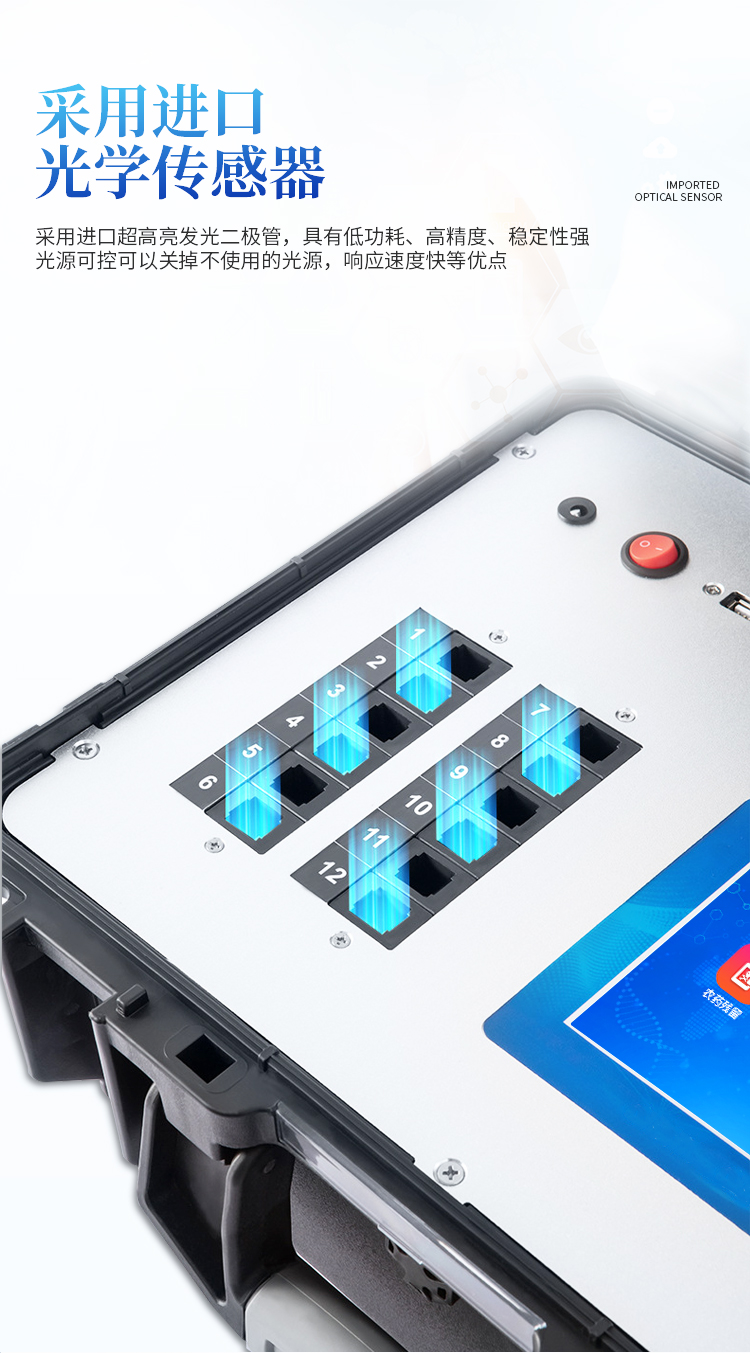 4、四波长冷光源,24个检测通道,每个通道均配置410、520、590、630nm波长光源,标配先进的光路切换装置,专业光路切换功能可实现最多64波长,并且所有检测项目可实现所有通道同时检测。