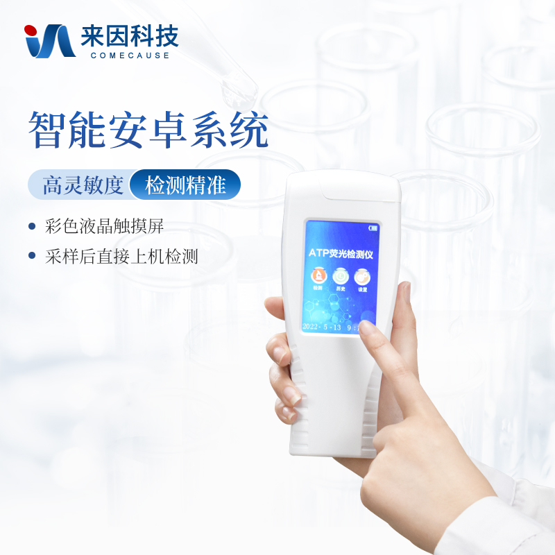 该设备为全新升级产品,安卓智能操作系统。操作采用生物化学反应方法检测ATP含量,ATP荧光检测仪基于萤火虫发光原理,利用“荧光素酶—荧光素体系”快速检测三磷酸腺苷(ATP)。ATP拭子含有可以裂解细胞膜的试剂,能将细胞内ATP释放出来,与试剂中含有的特异性酶发生反应,产生光,再用荧光照度计检测发光值,微生物的数量与发光值成正比,由于所有生物活细胞中含有恒量的ATP,所以ATP含量可以清晰地表明样品中微生物与其他生物残余的多少,用于判断卫生状况。